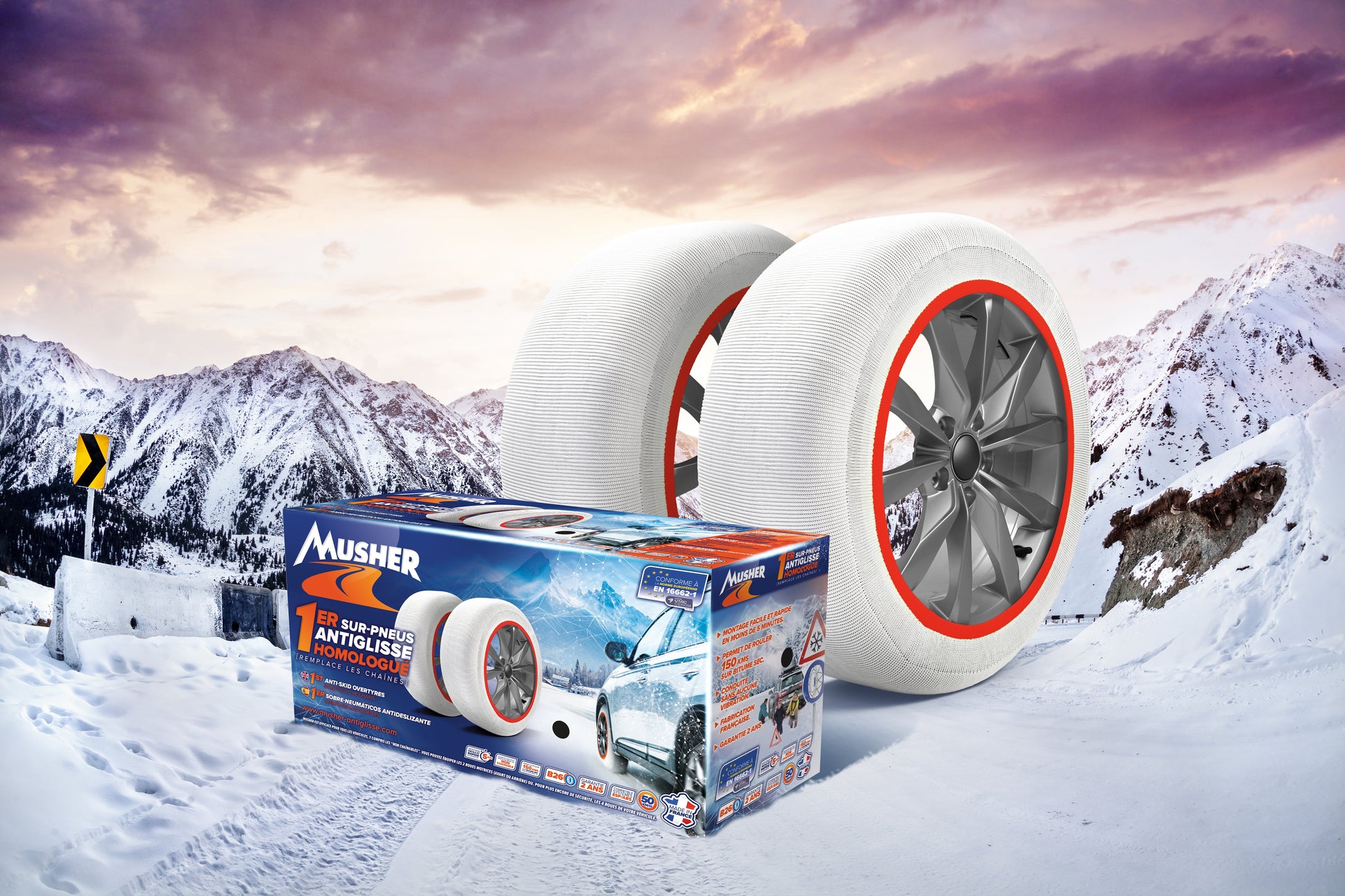 Made in France, patented, and compliant with French and European road standards, Musher is a 3D knitted snow sock which offers optimal grip on snow and ice. Intuitive to install, Made of high-tenacity fibers, the Musher over-tire is the only snow sock that guarantees a longevity of 150 km on dry asphalt. SUVs, sedans, electric cars, utility vehicles, non-chainable vehicles, motorhomes... Thanks to its shape memory technology, Musher adapts to all types of vehicles from 13 to 22 inches. These lightweight, space-saving, reusable and machine washable snow socks will never leave the trunk of your vehicle! The Musher over-tire is patented by the INPI and meets the EN 16662-1 standard.